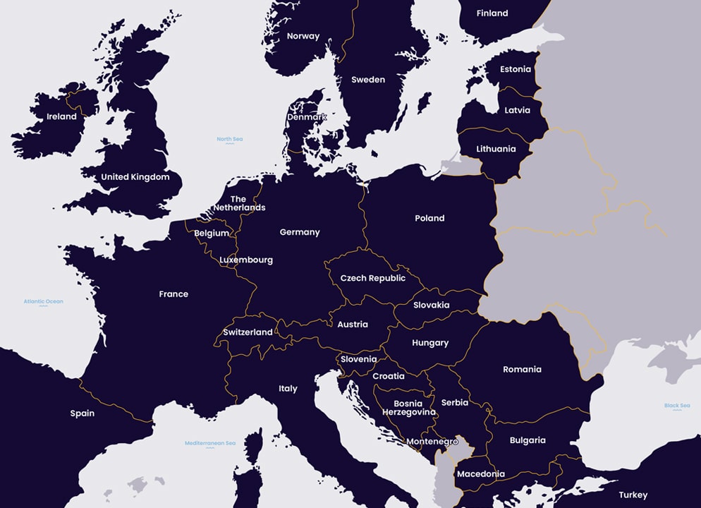 Alemania, Austria, Bélgica, Bosnia-Herzegovina, Bulgaria, Croacia, Dinamarca, Eslovaquia, Eslovenia, España, Estonia, Finlandia, Francia, Gran Bretaña, Grecia, Hungría, Irlanda, Italia, Letonia, Lituania, Luxemburgo, Macedonia del Norte, Montenegro, Noruega, Países Bajos, Polonia, Portugal, República Checa, Rumania, Serbia, Suecia, Suiza, Turquía.